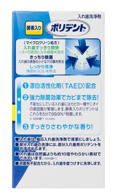 | 商品説明 | タンパク分解酵素が臭いの原因プラークを取り、強力洗浄成分が入れ歯にしみこんだガンコな汚れを取り、清潔さが一日持続します。ミントの香りで爽快です。除菌効果は99.9%。 |